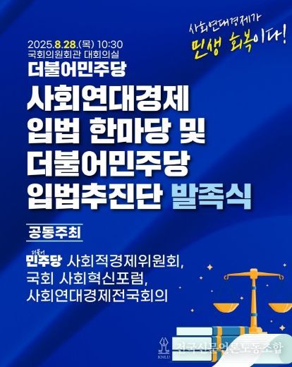 전국신문언론노동조합 강찬희 기자 | 이재명 정부 국정과제에 사회연대경제 활성화가 포함된 가운데, 28일 '사회연대경제 입법 한마당 및 더불어민주당 입법추진단 발족식'이 개최될 예정이다.
