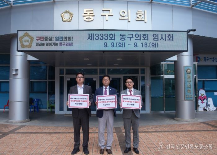 전국신문언론노동조합 이의용 기자 | 부산 동구의회 이상욱, 허근형, 김재헌 의원은 9월 16일 '해양수산부 부산 이전과 해양산업 경쟁력 강화를 위한 특별법 제정 촉구 성명서'를 발표했다. 이번 성명서는 해양수산부 이전이 단순한 청사 이전이 아닌 국가 전략적 과제임을 강조하며, 정부와 국회가 조속히 특별법을 제정할 것을 요구하는 내용을 담고 있다.