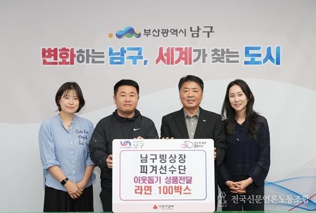 전국신문언론노동조합 이의용 기자 | 남구 빙상장을 이용하는 어린이 피겨선수단이 지난 15일 부산광역시 남구(구청장 오은택)에 라면 100박스를 기부했다.