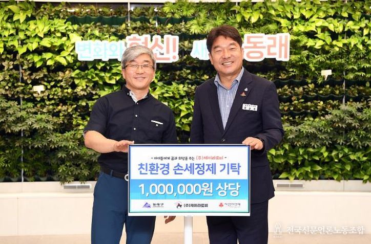 전국신문언론노동조합 이의용 기자 | 부산 동래구는 지난 17일 ㈜제이라로비(대표 김종달)로부터 천연소재로 만든 친환경 손세정제 세트(48개입 2박스)를 전달받았다고 밝혔다.