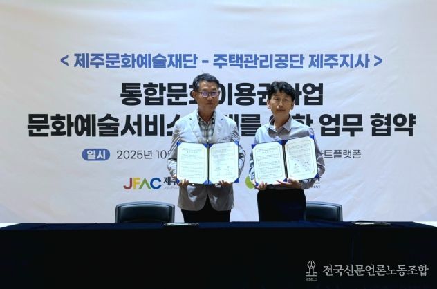 전국신문언론노동조합 김성길 기자 | 제주문화예술재단과 주택관리공단 제주지사는 지난 13일 통합문화이용권 사업(문화누리카드)과 연계한 문화예술 서비스 확대를 위해 업무협약을 체결했다.