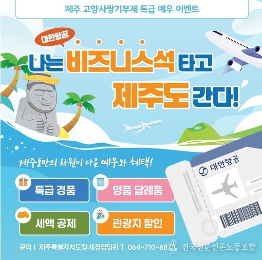 제주도는 10월 16일부터 11월 16일까지 한 달간 제주 고향사랑기부제 활성화를 위한 ‘나는 비즈니스석 타고 제주도 간다!’ 행사를 진행한다고 밝혔다.