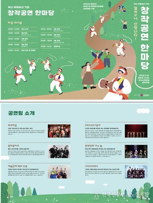 전국신문언론노동조합 조창제 기자 | 부산시는 오는 15일 오후 2시 부산시민공원 흔적극장에서 부산 무형유산의 새로운 활용 방향을 모색하는'2025 제2회 무형유산 기반 창작공연 한마당'을 개최한다고 밝혔다
