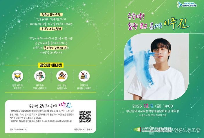 전국신문언론노동조합 조창제 기자 | 부산광역시교육청학생예술문화회관(관장 박은혜)은 오는 5일 오후 2시 학생예술문화회관 대극장에서 수능을 마친 고3 학생 700여 명을 대상으로 가수 이무진과 함께하는 ‘수능 이후! 힐링 토크 콘서트’를 개최한다.