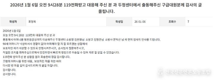 환자의 보호자는 천안서북소방서 칭찬게시판을 통해 “경황이 없는 상황에서 보호자인 제가 차분해질 수 있도록 안정시켜 주시고, 순서 있게 질문해 주셔서 적절한 조치를 할 수 있었다”며 “덕분에 어머니를 빠르게 병원으로 이송해 치료를 받을 수 있었다”고 깊은 감사의 뜻을 전했다.
