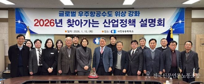 전국신문언론노동조합 강찬희 기자 | 경상남도는 15일 사천상공회의소에서 ‘2026년 찾아가는 산업정책 설명회’를 열고, 우주항공 분야 산업정책을 공유하는 한편 기업 현장의 애로사항을 청취했다고 밝혔다.