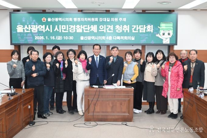 전국신문언론노동조합 강찬희 기자 | 울산시의회 강대길 의원은 16일 의회 4층 다목적회의실에서 주민, 시민경찰단체, 경찰위원회ㆍ경찰청 관계 부서 등과 함께 ‘울산광역시 시민경찰단체 의견 청취’ 간담회를 개최했다.