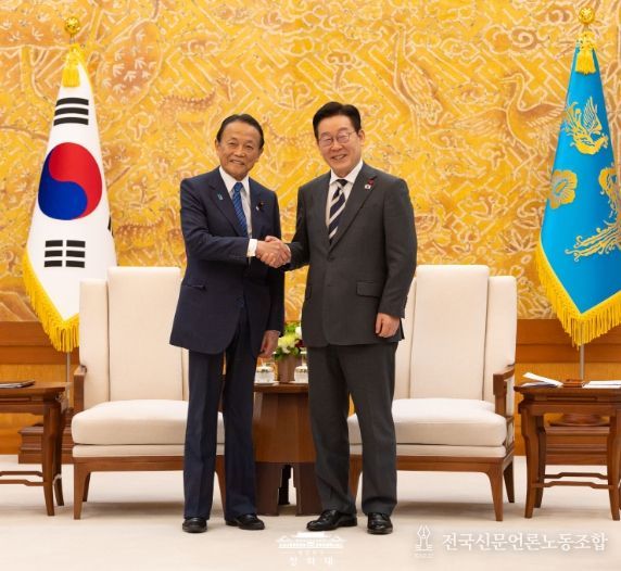 전국신문언론노동조합 강찬희 기자 | 이재명 대통령은 16일 16시부터 약 30분간 '서울-도쿄 포럼' 참석차 방한한 아소 다로(麻生 太郎) 전 일본 총리를 접견하고, 이번 주 진행된 나라(奈良) 방문(1.13.-14.)과 한일 정상회담 결과 등에 대해 이야기를 나누었다.