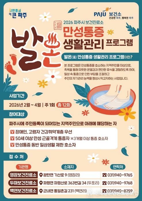전국신문언론노동조합 기자 | 파주시 보건진료소는 보건의료 취약지역 주민들의 건강증진을 위해 2026년 ‘발온(溫) 만성통증 생활관리’교실을 운영한다.