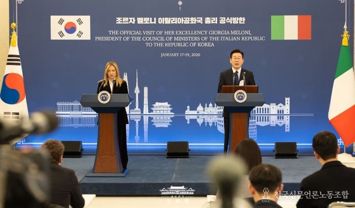 전국신문언론노동조합 강찬희 기자 | 이재명 대통령은 19일 조르자 멜로니 이탈리아 총리와의 정상회담 뒤 "저와 멜로니 총리는 전략적 동반자 명칭에 부합하는 미래지향적 수준으로 양국 관계를 더욱 발전시켜 나가기로 합의했다"고 밝혔다.