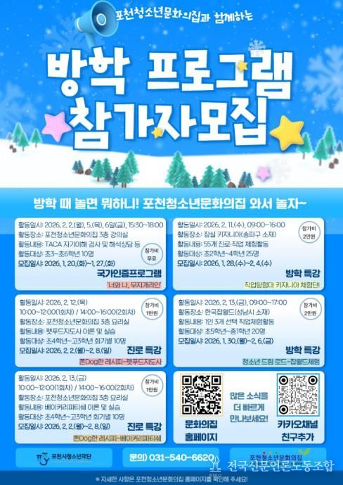 전국신문언론노동조합 기자 | 포천시청소년재단이 운영하는 포천청소년문화의집은 청소년들의 진로 탐색과 창의 역량 강화를 위한 겨울방학 프로그램 참가자를 모집한다.