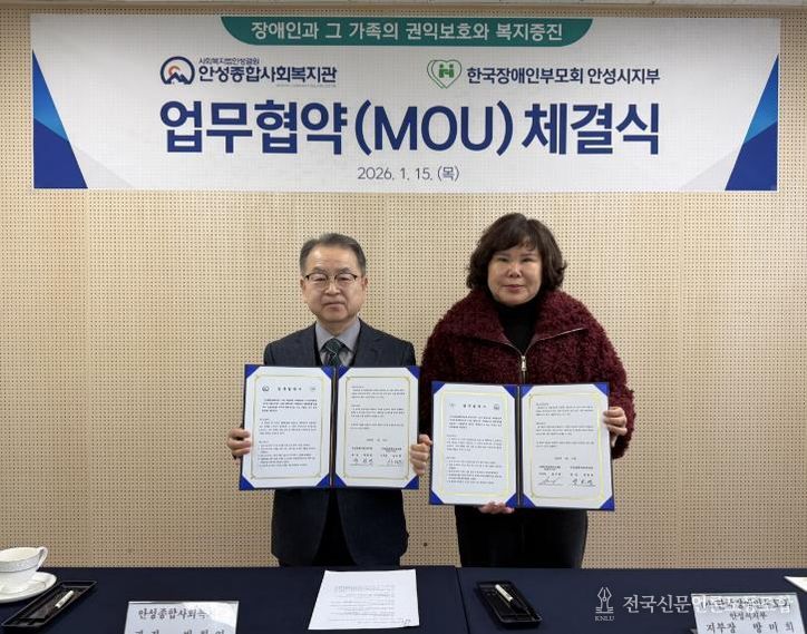 전국신문언론노동조합 기자 | 안성종합사회복지관은 지난 15일 (사)한국장애인부모회 안성시지부와 장애인·가족 권익 보호 및 복지 증진을 위한 업무협약(MOU)을 체결했다.