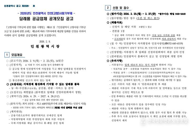 전국신문언론노동조합 강찬희 기자 | 인천광역시는 고향사랑 기부문화 확산과 지역경제 활성화를 이끌 답례품 발굴을 위해 2월 9일부터 '2026년 인천사랑기부제 답례품 공급업체'를 공개 모집한다고 밝혔다.