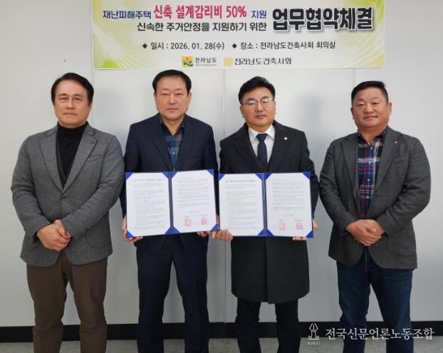 전국신문언론노동조합 강찬희 기자 | 전라남도는 태풍·집중호우 등 자연재난으로 주택 전파·반파 피해를 입은 도민의 신속한 주거 안정을 위해 대한건축사협회 전남도건축사회와 설계·감리비를 50% 감면하는 업무협약을 했다고 밝혔다.