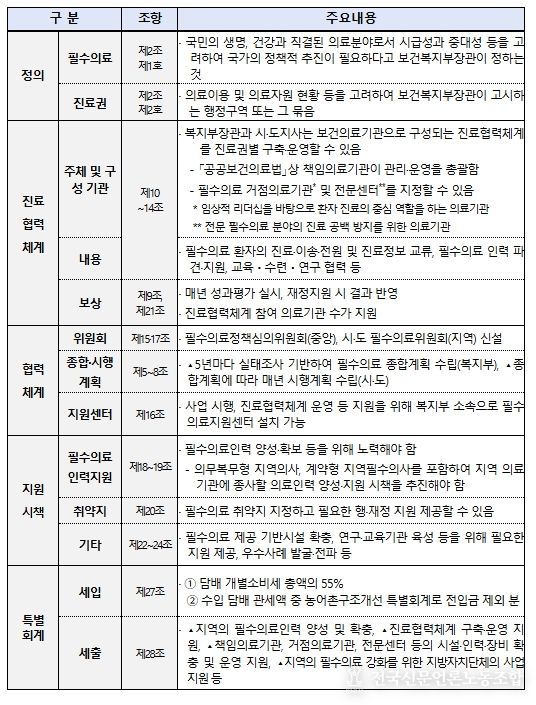 보건복지부장관은 진료권을 지정하고, 진료권별로 필수의료 진료협력체계를 구축·운영하도록 하여 지역 내 의료기관 및 인력 간 연계를 강화한다. 또한 필수의료 분야에서 일하는 보건의료인력을 체계적으로 양성하고, 확보하기 위한 지원이 강화되며, 의료서비스 제공이 어려운 취약지역에 대해서는 인프라 확충과 추가적인 지원을 통해 의료공백을 줄여 나간다.