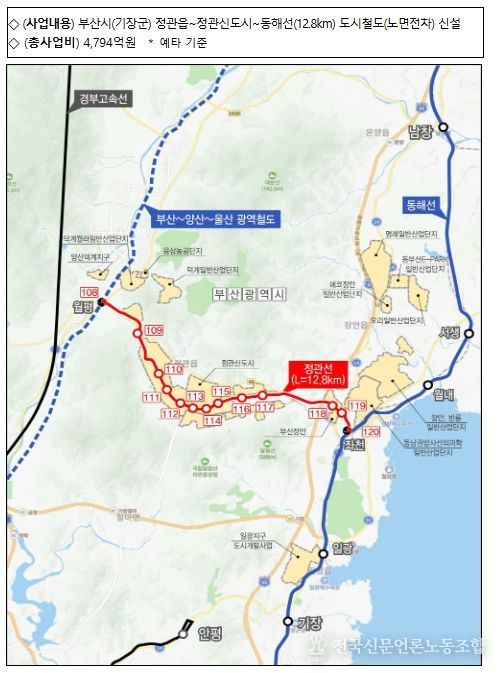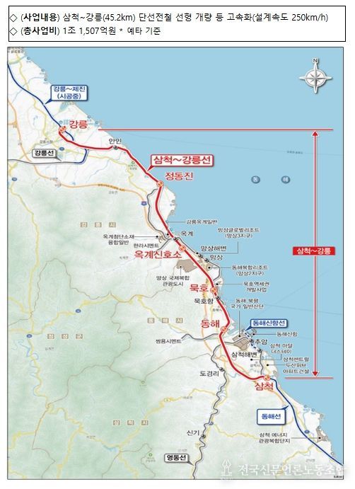 전국신문언론노동조합 강찬희 기자 | 국토교통부는 2월 12일 동해선 삼척-강릉 철도 고속화 사업과 부산도시철도 정관선 건설사업이 사업 타당성을 확보하여 예비타당성조사를 통과했다고 밝혔다.