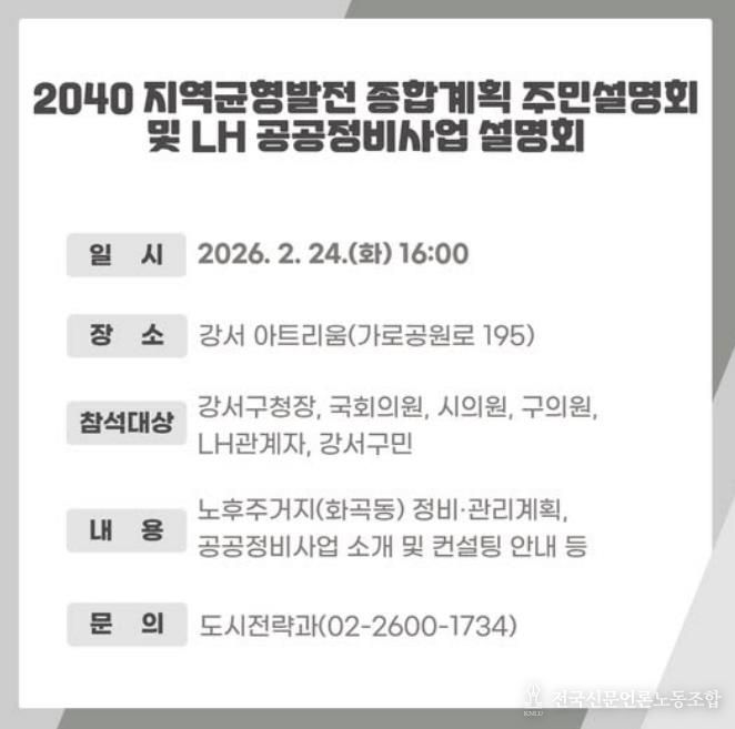 전국신문언론노동조합 강찬희 기자 | 서울 강서구는 오는 24일 오후 4시 강서아트리움(가로공원로 195)에서 지역 균형발전을 위한 주민설명회를 개최한다.