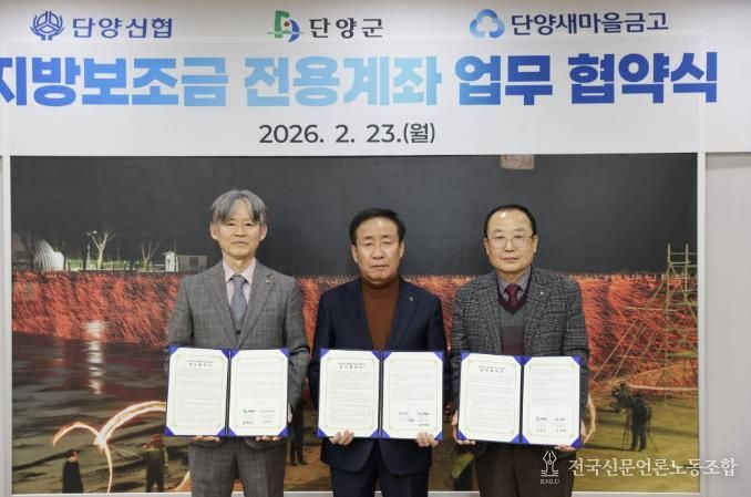 군은 지난 23일 단양군청 군수실에서 단양신협, 단양새마을금고와 ‘지방보조금 전용계좌 추가 개설·운영’을 위한 업무협약을 체결했다고 밝혔다.