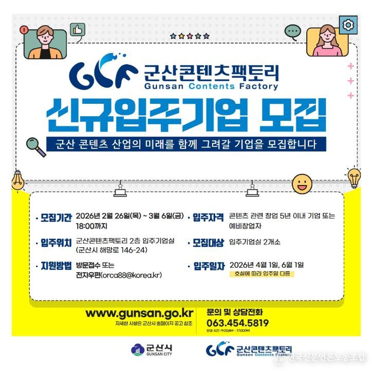 전국신문언론노동조합 강찬희 기자 | 군산시가 콘텐츠 산업 창업 활성화 및 지역 기업 육성을 위해 군산콘텐츠팩토리 신규 입주기업 2개사를 모집한다.