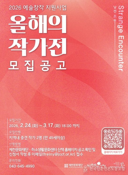 전국신문언론노동조합 김성길 기자 | 제천문화재단이 지역 시각예술 분야의 역량 있는 중견 작가를 발굴하고 창작 활동을 지원하기 위해 2월 24일부터 3월 17일까지'올해의 작가전' 참여 작가를 공개 모집한다.