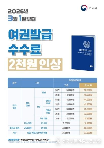 외교부가 지난 2005년 이후 20년 동안 물가 안정을 위해 동결해 왔으나, 차세대 전자여권의 제작단가 상승 등으로 내달 1일부터 2,000원을 인상한다는 방침에 따른 것이다.