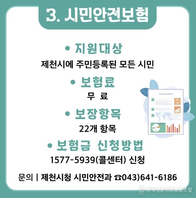 전국신문언론노동조합 김성길 기자 | 제천시는 예기치 못한 사고와 재난으로 피해를 입은 시민들의 생활 안정과 일상 회복을 지원하기 위한 시민안전보험을 전년도와 동일한 조건으로 올해도 갱신해 운영한다고 밝혔다.