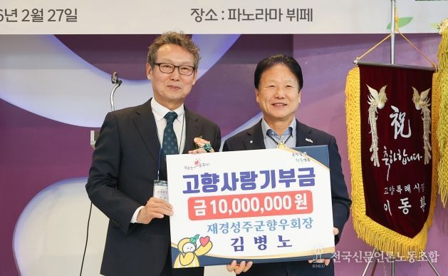 전국신문언론노동조합 강찬희 기자 | 재경성주군향우회 김병노 회장이 지난달 27일 서울 종로구에서 열린‘2026년 재경성주군향우회 신년 교례회’에서 고향 발전을 위한 고향사랑기부금을 1,000만 원 기탁했다.