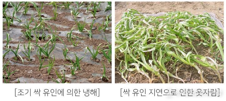 마늘 싹 유인 작업이 지연될 경우 멀칭 내부 온도 상승으로 인해 잎이 웃자라고 연약해져 고온과습 피해 및 병해충 발생으로 수량이 최대 30%까지 감소한다. 반대로 시기가 너무 빠르면 저온에 의한 냉해 피해로 수량이 10~15% 줄어든다.