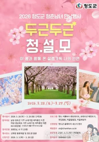 전국신문언론노동조합 강찬희 기자 | 경북 청도군은 다가오는 봄을 맞아 바쁜 직장 생활로 인연을 만날 기회가 부족했던 청년들을 위해, 아름다운 청도 관광 명소를 여행하며 자연스럽게 인연을 찾는 미혼남녀 만남행사‘청(도)설(렘)모(임) 프로젝트’를 개최하고 참가자를 모집한다고 밝혔다.