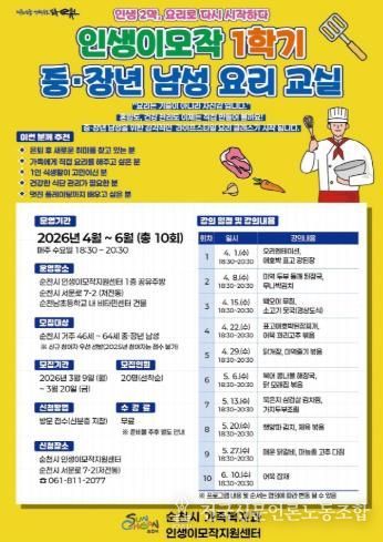 전국신문언론노동조합 강찬희 기자 | 순천시는 중·장년 남성의 건강한 식생활 형성과 활기찬 인생 2막 준비를 지원하기 위해 ‘중·장년 남성 요리교실’ 수강생을 모집한다고 밝혔다.