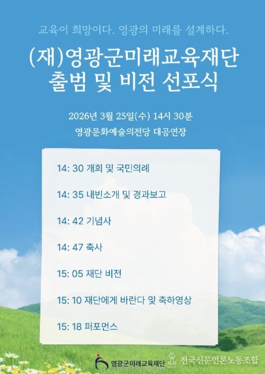 전국신문언론노동조합 강찬희 기자 | 영광군미래교육재단은 오는 3월 25일 오후 2시 30분, 영광문화예술의전당 대공연장에서 '영광군미래교육재단 출범 및 비전선포식'을 개최한다.