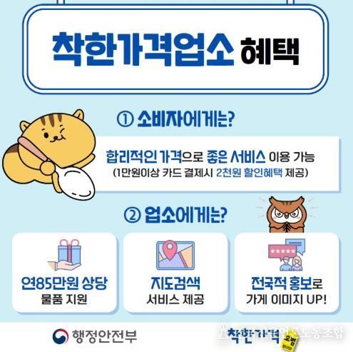 행정안전부가 주관하는 ‘착한가격업소를 찾습니다’, ‘착한가격업소 방문 인증 챌린지’ 등에 참여하면 선착순으로 기념품을 증정하며, 카드사별 할인 등 다양한 혜택도 제공된다.