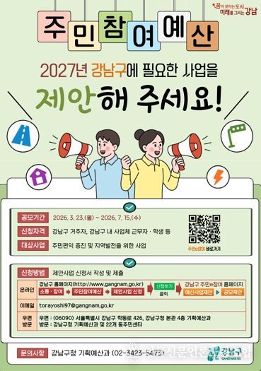 전국신문언론노동조합 강찬희 기자 | 꿈이 모이는 도시, 미래를 그리는 강남구가 2027년도 예산편성에 반영할 주민참여예산 제안사업 공모를 3월 23일부터 7월 15일까지 진행한다. 올해 공모 규모는 총 13억 원으로, 주민이 직접 생활 속 불편을 해결하고 지역에 필요한 사업을 제안해 예산에 반영하는 참여형 제도다.