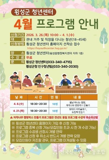 전국신문언론노동조합 강찬희 기자 | 횡성군 청소년 성년기 이행과 청년들의 건강한 성장을 지원하는 횡성군 청년센터가 오는 26일부터 ‘4월 프로그램’ 수강생을 모집한다.