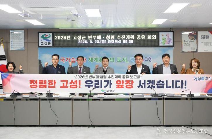전국신문언론노동조합 강찬희 기자 | 고성군은 3월 23일 군청 중회의실에서 군수 주재로 국장 및 부서장 등 간부공무원들이 참석한 가운데 ‘2026년 반부패·청렴 추진계획 공유 회의’를 개최했다고 밝혔다.