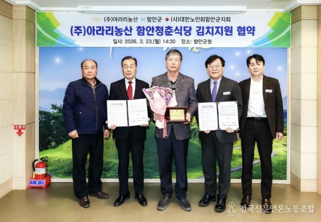 전국신문언론노동조합 강찬희 기자 | 함안군은 지난 23일 ㈜아라리농산과 (사)대한노인회 함안군지회가 함안청춘식당 이용 어르신들의 건강한 식생활 지원을 위한 ‘사랑의 김치 후원 협약’을 체결했다고 밝혔다.