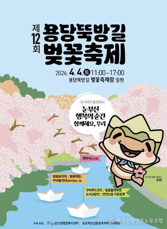 전국신문언론노동조합 강찬희 기자 | 순천시 삼산동행정복지센터는 4월 4일 동천 벚꽃길 일대(용당동 705)에서 ‘국가하천 동천에서 눈부신 행복의 순간 함께해요, 우리’라는 주제로 제12회 용당뚝방길 벚꽃축제를 개최한다고 밝혔다.