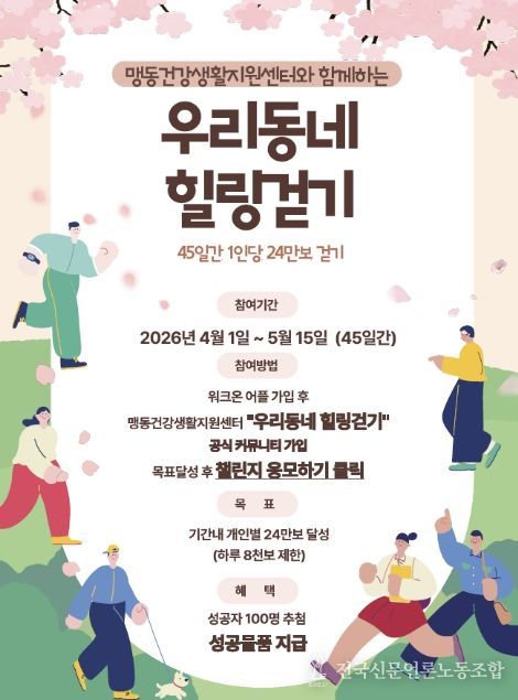 전국신문언론노동조합 김성길 기자 | 충북 음성군 맹동건강생활지원센터는 주민들의 걷기 실천율을 높이고 비만, 우울, 고혈압 등 기저질환 관리를 돕기 위해 오는 4월부터 ‘우리동네 힐링걷기’ 챌린지를 운영한다.