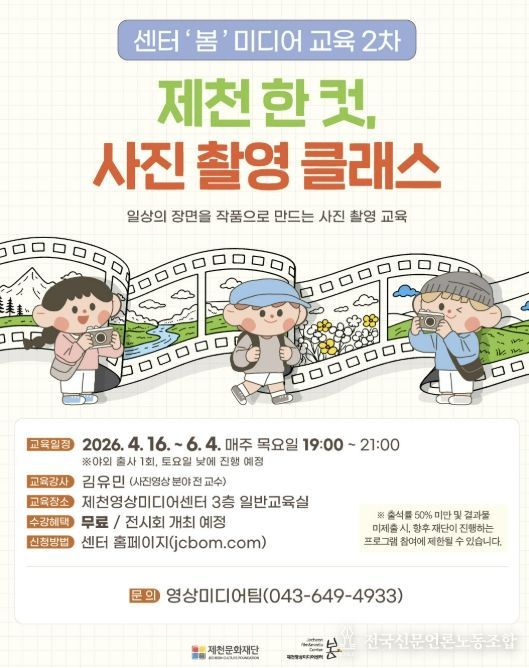 전국신문언론노동조합 김성길 기자 | 제천문화재단이 오는 31일부터 사진 촬영 교육 ‘제천 한 컷, 사진 촬영 클래스’의 수강생을 모집한다.