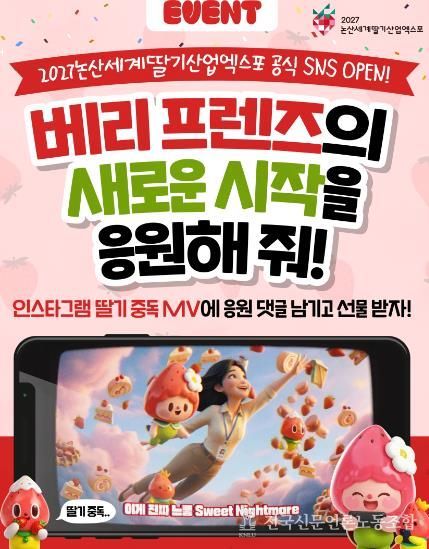 전국신문언론노동조합 강찬희 기자 | 논산세계딸기산업엑스포조직위원회는 ‘2027 논산세계딸기산업엑스포’ 공식 SNS 채널 오픈을 기념해 팔로우 이벤트를 진행한다고 밝혔다.