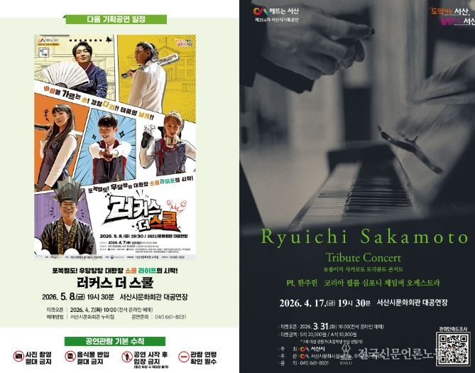 정동호 서산시 문화시설사업소장은 “이번 트리뷰트 콘서트는 류이치 사카모토의 음악을 사랑해 온 시민들에게 깊은 위로와 감동을 전하는 시간이 될 것”이라며 “앞으로도 세계적 예술가의 작품을 조명하는 수준 높은 기획공연을 지속적으로 선보이겠다”라고 밝혔다.
