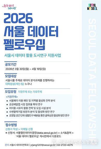 시는 3월 30일부터 4월 19일까지 ‘2026 서울 데이터 펠로우십’ 참여자를 모집하고, 대학원생 등 청년 분석 인재를 중심으로 도시문제 해결 프로젝트를 추진한다고 밝혔다.