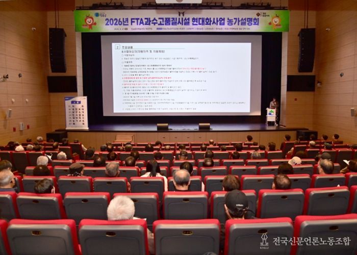전국신문언론노동조합 강찬희 기자 | 청송군은 지난 27일 청송문화예술회관 대공연장에서 청송농협조합공동사업법인(대표 김태환) 주관으로 '2026년 과수고품질시설현대화사업 설명회'를 개최했다.