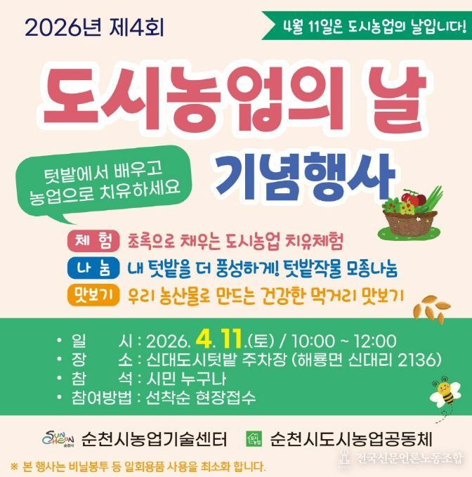 전국신문언론노동조합 강찬희 기자 | 순천시는 오는 4월 11일 오전 10시 신대도시텃밭에서 ‘2026년 제4회 도시농업의 날 기념행사’를 개최한다고 밝혔다.