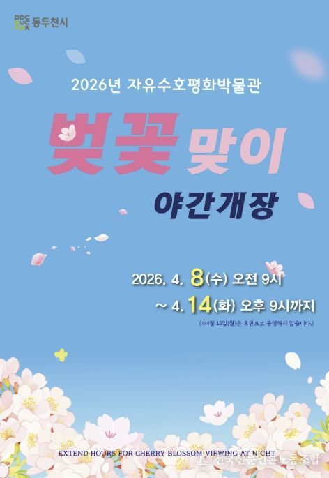 전국신문언론노동조합 김성길 기자 | 동두천시 자유수호평화박물관은 오는 4월 8일부터 14일까지 6일간(4월 13일 월요일 정기 휴관) 벚꽃 개화기를 맞아 자유수호평화박물관 개관 시간을 기존 오후 6시에서 오후 9시까지 연장 운영한다고 밝혔다.