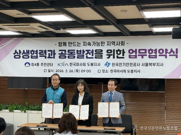전국신문언론노동조합 강찬희 기자 | 서울 도봉구 창4동은 지난 3월 26일 한국마사회 도봉지사 1층 전자카드센터에서 한국마사회 도봉지사, 한국전기안전공사 서울북부지사와 ‘함께 만드는 지속가능한 지역사회 상생협력과 공동발전’ 업무협약을 체결했다.