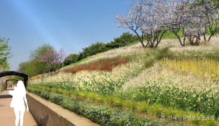 ▲제방은 은빛 물결은 담은 제방숲으로 탄생한다. 제방사면은 호안의 기능을 유지한 채 코코넛 섬유를 활용한 자연 친화적인 식재 기반을 만들고, 물억새·수크령 등이 어우러져 신비로운 분위기를 연출한다. 또, 탄천1교~탄천2교 진출입로에는 다양한 수종의 꽃을 심어 야생화 정원을 조성할 계획이다.