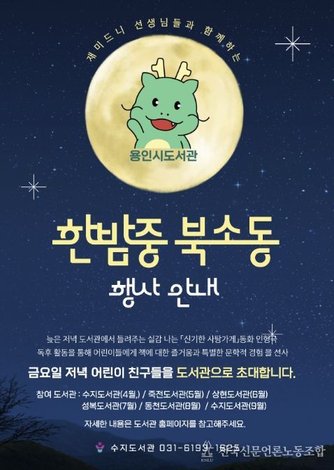 전국신문언론노동조합 김성길 기자 | 용인특례시 서부도서관은 수지‧죽전‧상현‧성복‧동천도서관에서 야간 독서문화 프로그램 ‘한밤중 북소동’을 운영한다고 25일 밝혔다.