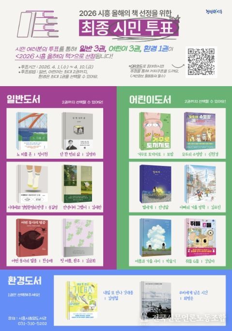이번 시민 투표는 일반 6권, 어린이 6권, 환경 2권 등 총 14권을 대상으로 진행되며, 투표 결과를 반영해 최종 7권(일반 3권, 어린이 3권, 환경 1권)이 ‘2026 시흥 올해의 책’으로 선정된다.