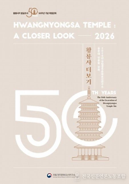 전국신문언론노동조합 강찬희 기자 | 국가유산청 국립문화유산연구원 국립경주문화유산연구소는 황룡사지 발굴조사 50주년을 맞아 2026년 숭문대 인문학 강좌 '황룡사 더보기'를 오는 4월 8일부터 10월 15일까지 경주 보문단지 내 황룡원에서 개최한다.